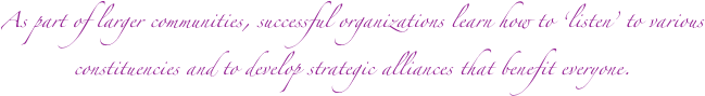 TCG can assist organizations with the development, facilitation and implementation of small and large group processes that enable it to gain valuable input from its constituencies. We can also provide consultation and resources for the assessment and development of strategic alliances and various partnering models.